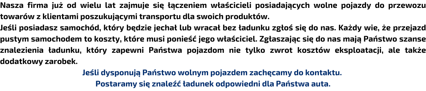 Nasza firma już od wielu lat zajmuje się łączeniem właścicieli posiadających wolne pojazdy do przewozu towarów z klientami poszukującymi